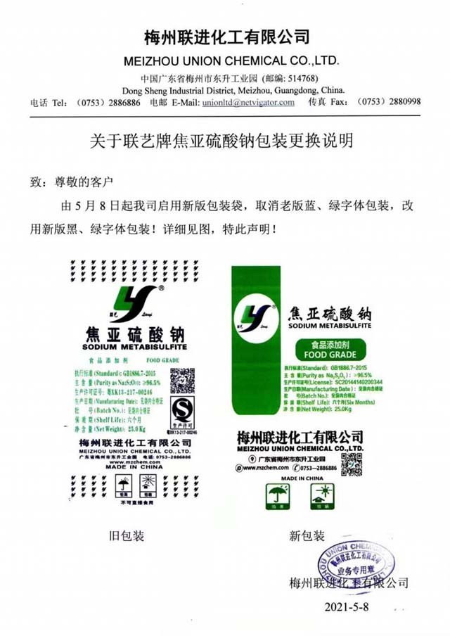 包裝更換通知:即2021年5月8號(hào)起聯(lián)藝牌焦亞硫酸鈉啟用新版包裝袋。